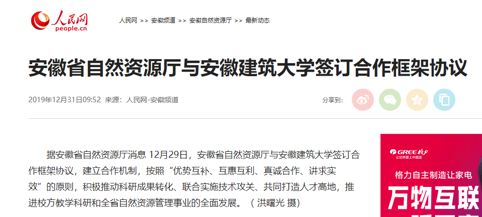 编者按:12月29日,我校与安徽省自然资源厅签订合作框架协议,建立合作机制,人民网、中安在线对此进行了报道。