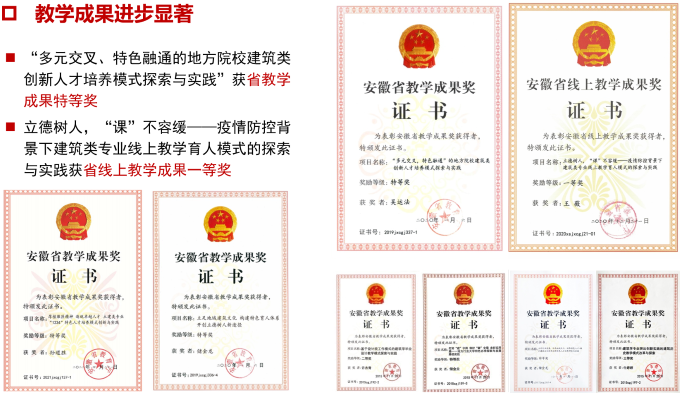 2、深化“特色凝练、多方协同” 建筑学专业人才育人模式。专业建设对“服务于安徽地域性”予以高度重视,寻求结合学校特色且适合自身的路径和方法。从基础理论教学和创新设计教学等综合实现“区域性关注”;通过工程实践深入挖掘徽派文化传承、遗产保护利用;利用丰富徽州文化资源,加强学生对本土文化的认识与理解。多方协同破解专业教育与社会实践需求不够紧密问题,建立科教、校地、校企和校际等多方参与、融合协同的育人平台。科教协同注重学科发展与专业教育同频共振,校地协同开展实践教学与社会服务协同育人,校企协同突出联合培养和反馈机制建设,校际协同营造开放式的联合教学育人环境。