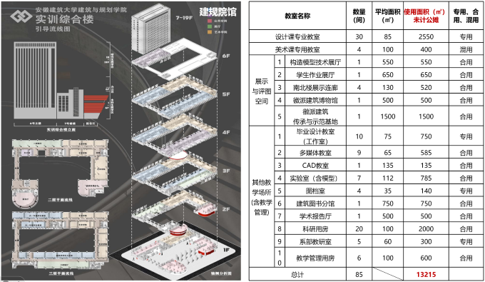 设有专用展厅全面展示学院各专业的作业、教学、科研成果以及国内外合作交流、校园文化等;利用走道、南北连廊、作业展厅作为学生作业展示和评阅空间;CAD教室、美术画室用于建筑相关软件教学和美术教学;学术报告厅、多媒体教室等,开展学术活动、理论教学等;专用的扫描复印室、图档室,保存学生作业;合用的建筑图书分馆,构造模型技术展厅用于学生学习先进的前沿专业知识。有建筑设计院、规划设计院、省级科研平台等实践平台用于学生实习与实践训练,另有徽派博物馆及徽派建筑传承与示范基地,专门用于学生学习及研究地域建筑及徽州文化。