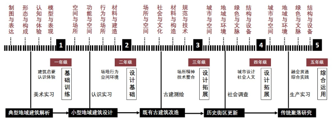 1、构建“纵横结合、系统发展”建筑学专业人才培养模式。“纵”强调“2+3”即“通识平台+专业拓展”的专业培养模式,前二年为建筑类专业基本统一的通识教育和专业基础,后三年转入相应的精专方向的深造,重点放在后三年的专业拓展及实践能力培养。“横”强调贯穿1-5年级的“大土建”学科知识,积极适应“建构大学科发展、多学科交叉”的理念和发展趋势,以学生综合能力、实践能力、创新能力培养为主线,紧紧围绕专业核心课程,加强与其他相关专业的交叉融合,夯实学生专业综合基础,拓展宽口径输出。