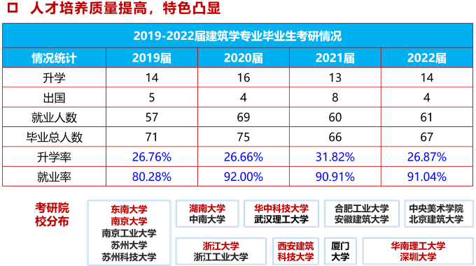 3、我校作为土建类学科为特色的高校,对建筑学专业建设支持力度大。建筑学专业是学校的龙头专业和品牌优势专业,办学历史长教学经验丰富,建筑学专业5次通过住建部专业教育评估,为国家一流专业、省特色(品牌)专业建设点以及安徽省高峰学科。学校对建筑学专业持续加强建设,在教学条件及学科专业建设支持上一直处于校内领先地位。