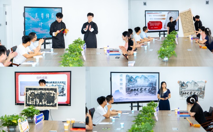 2025年度“美育传薪计划” 团队成员带着原创美育成果,走进建大科研特区,与特种电线电缆国家地方联合工程研究中心一线科研人员展开面对面的交流。他们展示的成果,是灵感与匠心的结晶:以建大校训为创作内核的书法作品,力透纸背间传递着建大特有的精神力量;以九月桥为灵感的国画,水墨晕染中勾勒出校园的灵动之美;歌颂安徽革命精神的原创快板书,节奏铿锵间激荡起爱国情怀;非遗鱼灯、木刻版画,承载着文化传承的使命。科研人员与同学们热烈探讨,思维的火花在艺术与科技的碰撞中迸发,打破壁垒,实现人文与科技的跨界对话。科研人员也向同学们分享学校最新科研项目进展,点亮了同学们探索未知的明灯,大家携手并肩,共同为建筑大学的发展注入活力。