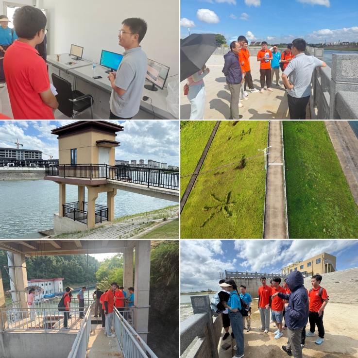 离开管理房,团队前往拦河坝现场深入考察。在观察闸室、消力池等结构时,师生发现闸门间卡有枯木,工作人员通过调节闸门水流成功疏导,让同学们实地见证闸门运行的稳定性。针对“输水管道进口为何设滤网”的疑问,余金煌教授与方佩佩老师详解:滤网可截留杂质,避免管道堵塞与设备磨损,生动诠释工程设计的细节考量。同时,团队也留意到工程现存缺陷,如混凝土细微裂缝、钢筋外包混凝土施工质量隐患等,师生就此展开热烈讨论,深化对工程耐久性的理解。行程中,团队还在河上游发现小型水工建筑物,通过平面钢闸门与控制房的联动原理,进一步掌握水位与流量调节机制。最后,无人机俯瞰视角下,拦河坝与水面、周边设施相映成景,让同学们深刻感悟水利工程平衡生态与民生的智慧,为第一天实践画上圆满句号。