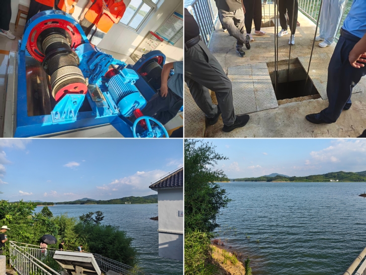 实践团队抵达天子门村后,即刻前往天子门水库管理处,受到水库负责人的热情接待。在会议室,负责人详细介绍了水库概况:该水库兴建于1959年冬,1966年冬竣工,1976年冬翻修大坝,为郎溪县中型水库之一,2010年获批第十批国家级水利风景区,兼具灌溉、防洪、城乡供水及生态调节功能,灌溉覆盖近2万亩农田,守护下游3个行政村的防洪安全,近年还发展生态养殖助力地方经济。随后,负责人坦诚分享了水库现存问题,特别是工作闸附近的混凝土蜂窝状裂缝可能引发的结构承载能力下降、钢筋锈蚀、渗漏等风险,师生决定前往现场实地探查。